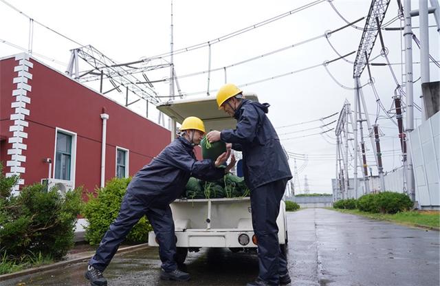 國網(wǎng)上海超高壓公司員工在±500千伏南橋換流站開展防臺風防汛準備工作。