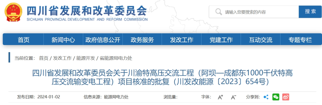 據(jù)四川省發(fā)改委網(wǎng)站1月2日消息,國網(wǎng)四川省電力公司川渝特高壓交流工程(阿壩—成都東1000千伏特高壓交流輸變電工程)獲四川省發(fā)改委核準(zhǔn)批復(fù)。