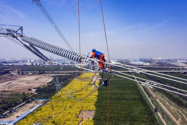 國網(wǎng)天津電力工作人員在板濱500千伏線路工程現(xiàn)場開展高空走線作業(yè)。6月6日攝 國網(wǎng)天津電力供圖