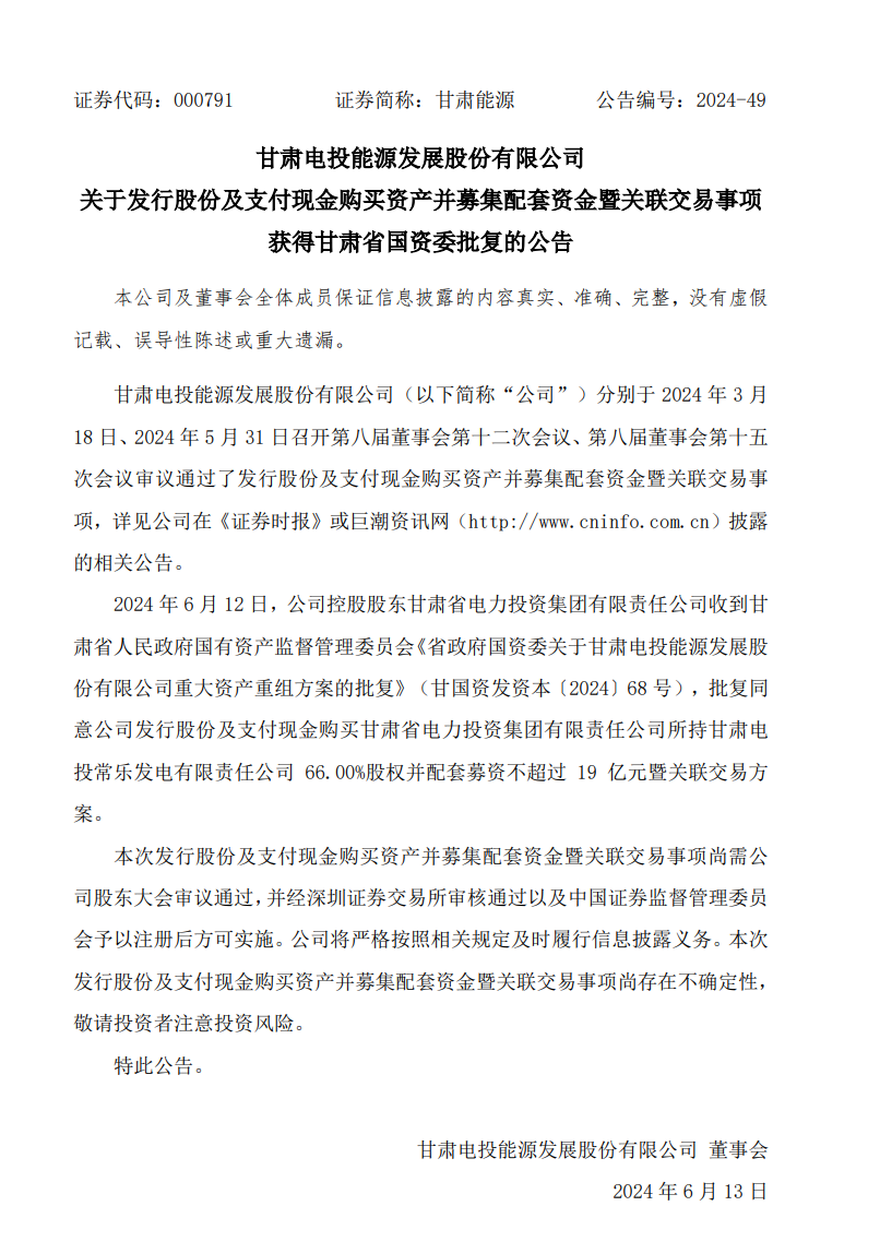 甘肅能源發(fā)布公告稱,6月12日,公司控股股東甘肅省電力投資集團(tuán)有限責(zé)任公司收到甘肅省人民政府國(guó)有資產(chǎn)監(jiān)督管理委員會(huì)《省政府國(guó)資委關(guān)于甘肅電投能源發(fā)展股份有限公司重大資產(chǎn)重組方案的批復(fù)》(甘國(guó)資發(fā)資本〔2024〕68號(hào)),批復(fù)同意公司發(fā)行股份及支付現(xiàn)金購(gòu)買甘肅省電力投資集團(tuán)有限責(zé)任公司所持甘肅電投常樂(lè)發(fā)電有限責(zé)任公司66.00%股權(quán)并配套募資不超過(guò)19億元暨關(guān)聯(lián)交易方案。