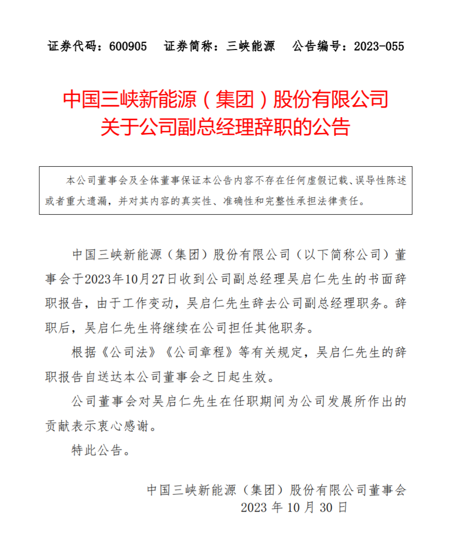 三峽能源10月30日公告稱,公司董事會于2023年10月27日收到副總經(jīng)理吳啟仁先生的書面辭職報告,由于工作變動,吳啟仁先生辭去公司副總經(jīng)理職務(wù)。辭職后,吳啟仁先生將繼續(xù)在公司擔(dān)任其他職務(wù)。