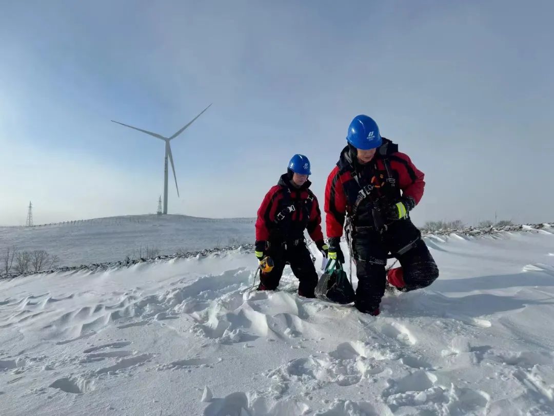 山西公司組織點(diǎn)檢員在雪后開展風(fēng)機(jī)和集電線路巡檢工作,點(diǎn)檢員在零下十幾度的刺骨寒風(fēng)中踩著30厘米深的積雪,連續(xù)3天徒步行走50余公里,累計(jì)排查72基鐵塔,確保第一時(shí)間掌握設(shè)備情況,全力抗擊冰雪挑戰(zhàn)。