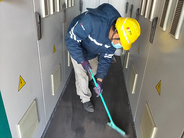 該電站毗鄰當(dāng)?shù)貫跆m布和沙漠,廠址周邊植被少,冬季多為大風(fēng)天氣,為防止光伏板被風(fēng)吹落,該公司運維人員對光伏組件基礎(chǔ)進(jìn)行細(xì)致檢查,對相對薄弱的區(qū)域進(jìn)行埋石填土加固,對組件支架銹蝕的螺栓及時進(jìn)行更換,對傾斜的立柱進(jìn)行校正固定;站內(nèi)防凍措施已提前落實,但隨著氣溫的降低,相關(guān)防護(hù)需要每日一檢,該公司運維人員對生活水井的保暖措施進(jìn)行再加固,在井蓋上方罩住多層保溫被,隔離井口積水,為閥門制作防護(hù)罩,保證生活用水正常供應(yīng),同時對電暖氣和空調(diào)開展全面檢查,對用電負(fù)荷電流進(jìn)行鉗測,避免過負(fù)荷故障和火災(zāi)事故;在主設(shè)備風(fēng)沙防治上,這群年輕人狠下功夫,他們每天在太陽下山前開好工作票,在太陽下山后做好安全措施,集中清掃逆變器室和箱變室塵土和更換濾網(wǎng),每日清掃一組,一個月一輪回,解決逆變器及箱變積沉較多、散熱不良問題;在送出線路檢查上,他們每日對17條站內(nèi)線路和1條送出線路進(jìn)行徒步巡線,細(xì)致檢查桿塔金具、導(dǎo)線、地線固定情況,并利用夜間停電機會及時消除異常隱患,保證涉網(wǎng)設(shè)備正常運行。
