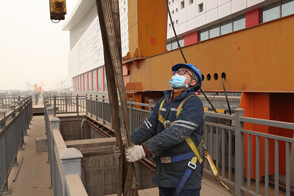 一線(xiàn)職工地面指揮起重門(mén)機(jī)運(yùn)行