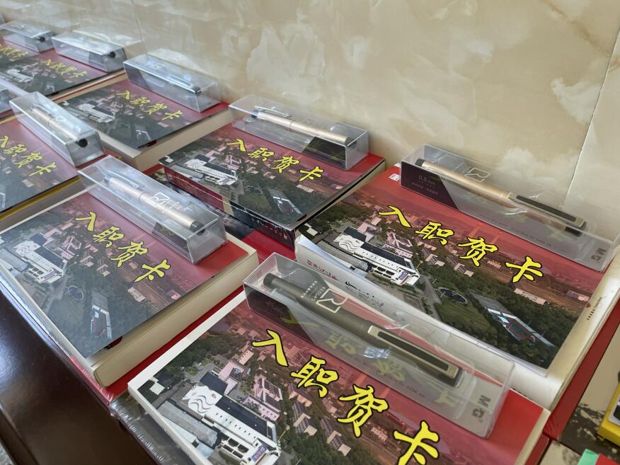活動現(xiàn)場,該公司領(lǐng)導(dǎo)為新員工發(fā)放“入職賀卡”“入職學(xué)習(xí)大禮包”并與他們合影留念。(周佩)