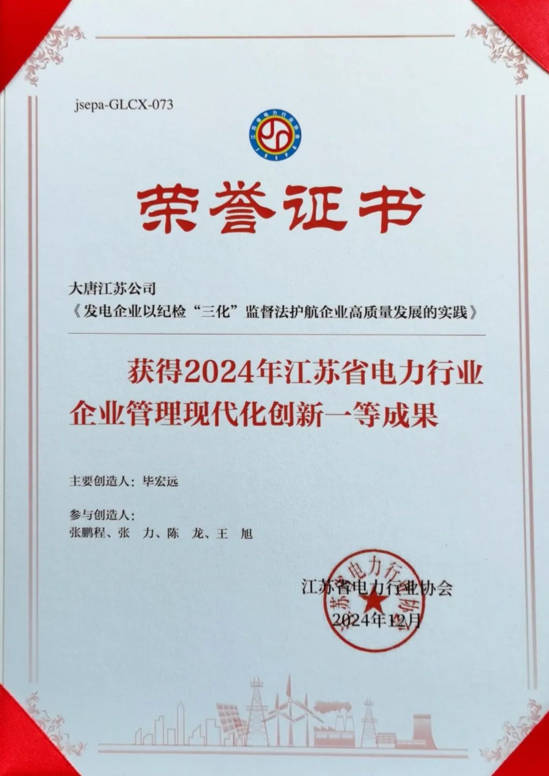 大唐江蘇公司紀委榮獲江蘇省電力行業(yè)企業(yè)管理現(xiàn)代化創(chuàng)新“一等成果”