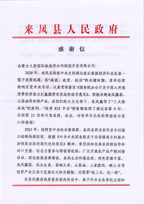 2021年4月22日,大唐海勃灣水利樞紐公司收到來自湖北省來鳳縣人民政府的感謝信,對大唐海勃灣水利樞紐公司無私的幫助表示衷心的感謝。