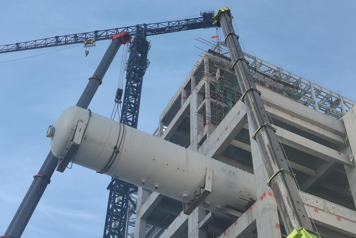 項(xiàng)目部地處北疆,氣候惡劣,最低氣溫逼近零下30攝氏度,7級以上大風(fēng)天氣屢見不鮮,整體吊裝施工技術(shù)難度大。為確保吊裝作業(yè)安全高效完成,項(xiàng)目縝密策劃、精心組織,組織多次進(jìn)行技術(shù)交底,編寫專項(xiàng)施工方案,確認(rèn)現(xiàn)場作業(yè)條件,對作業(yè)人員資質(zhì)、吊裝設(shè)備、吊索具以及安全機(jī)構(gòu)穩(wěn)定等方面進(jìn)行了仔細(xì)的檢查與確認(rèn)。項(xiàng)目領(lǐng)導(dǎo)堅(jiān)守一線,各部門協(xié)同共進(jìn),默契配合,起鉤,設(shè)備轉(zhuǎn)向,接觸軌道,200噸汽車吊送入、脫鉤,500噸汽車吊送入,整體進(jìn)入軌道,電動(dòng)葫蘆拖動(dòng)就位,整個(gè)過程一氣呵成,當(dāng)日18點(diǎn)18分除氧器順利就位。