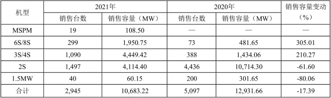 2021年,在金風(fēng)科技實(shí)現(xiàn)對外銷售的10.68GW中,2S平臺(tái)機(jī)組銷售容量同比下降61.6%,占比降至38.5%;大功率和高毛利的6/8S平臺(tái)機(jī)組銷售容量同比提升305%,占比提升至18.3%。而且中速永磁產(chǎn)品也實(shí)現(xiàn)了首次銷售。