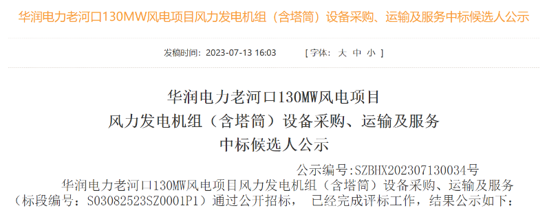 7月13日,華潤集團電子招標采購平臺發(fā)布《華潤電力老河口130MW風電項目風力發(fā)電機組(含塔筒)設備采購、運輸及服務中標候選人公示》的公告。