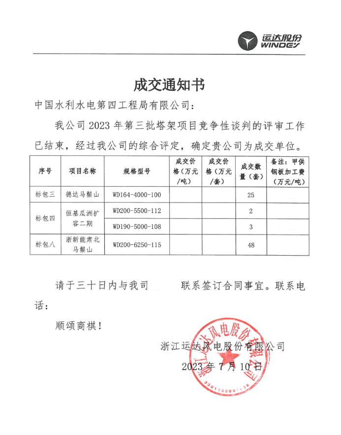 近日,市場開發(fā)傳來捷報,中國水電四局成功中標(biāo)浙江運(yùn)達(dá)德達(dá)馬鬃山、恒基瓜州擴(kuò)容二期、浙新能肅北馬鬃山3個風(fēng)電項目,上述項目由中國水電四局(酒泉)新能源裝備有限公司承建。