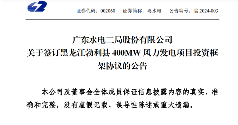 公告披露,2024 年1月11日,粵水電與黑龍江省七臺河市勃利縣人民政府(以下簡稱“勃利縣人民政府”)簽訂《勃利縣400MW風力發(fā)電項目投資框架協(xié)議》。公司擬在勃利縣境內(nèi)開發(fā)裝機規(guī)模400MW風力發(fā)電項目,估算總投資約20億元。