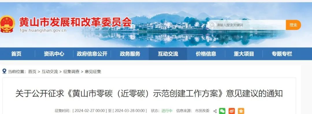 近日,安徽黃山市發(fā)改委發(fā)布關于公開征求《黃山市零碳(近零碳)示范創(chuàng)建工作方案》意見建議的通知。