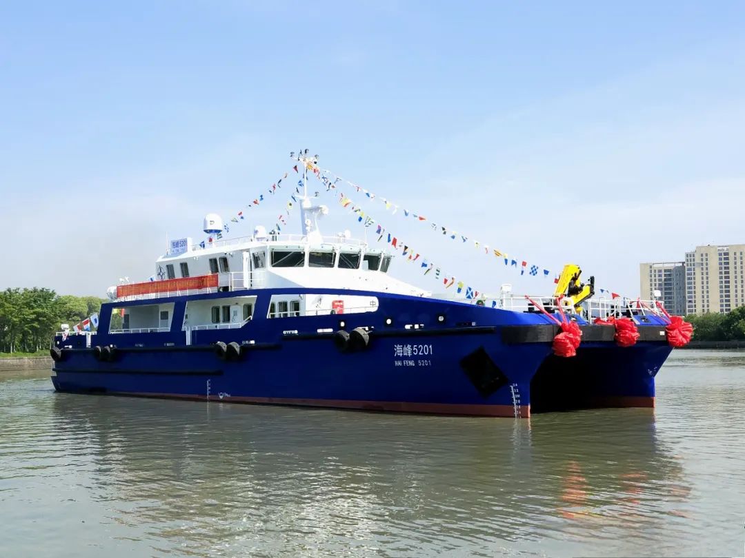 “海峰5201”風(fēng)電運(yùn)維船是中交海峰風(fēng)電打造的最新一代海上風(fēng)電運(yùn)維船舶(CTV),該船入級CCS船級社,鋼鋁雙體結(jié)構(gòu),總長40米,型寬10.8米,型深5.2米,續(xù)航能力達(dá)到1000海里,額定載客12人,試航航速約18節(jié),快速性好、耐波性強(qiáng),各項(xiàng)性能指標(biāo)處于國內(nèi)先進(jìn)水平。