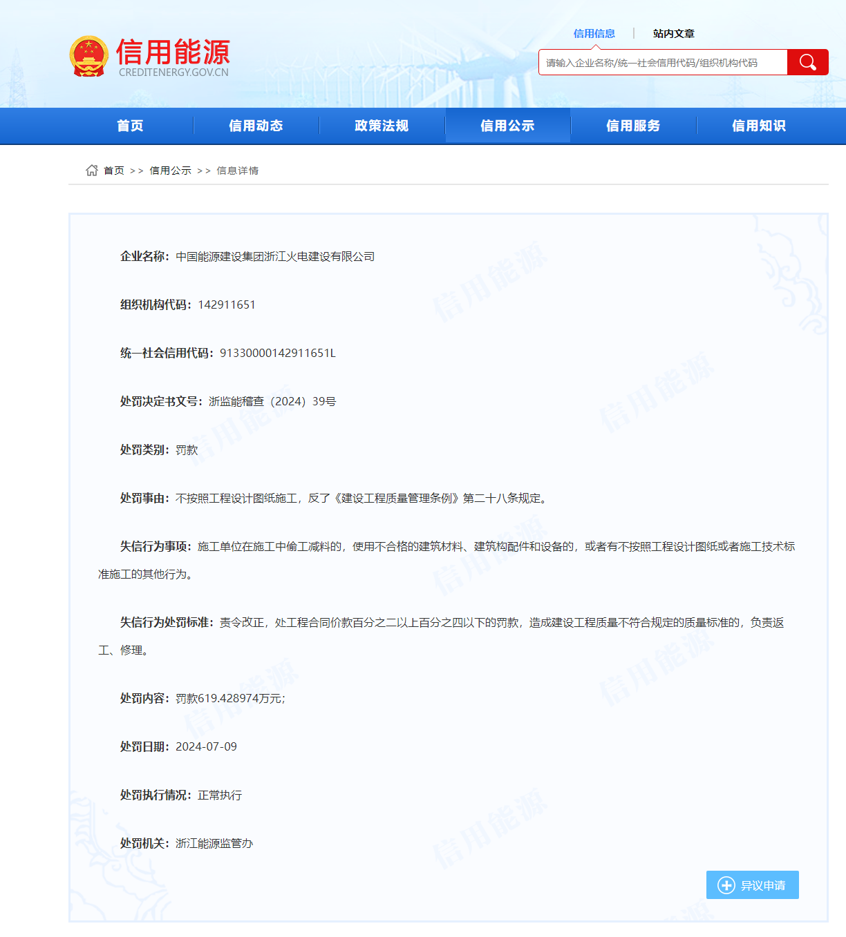 浙江能源監(jiān)管辦發(fā)布的《行政處罰決定書》(浙監(jiān)能稽查〔2024〕39號)中依據(jù)《建設工程質量管理條例》(下稱“條例”)第六十四條對中國能建浙江火電處以了619萬余元的罰款。條例明確:施工單位在施工中偷工減料的,使用不合格的建筑材料、建筑構配件和設備的,或者有不按照工程設計圖紙或者施工技術標準施工的其他行為的,責令改正,處工程合同價款百分之二以上百分之四以下的罰款;造成建設工程質量不符合規(guī)定的質量標準的,負責返工、修理,并賠償因此造成的損失;情節(jié)嚴重的,責令停業(yè)整頓,降低資質等級或者吊銷資質證書。