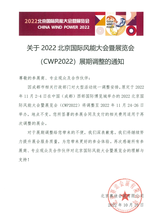 根據(jù)成都市相關(guān)行政部門對大型活動統(tǒng)一調(diào)整安排,原定于2022年11月2-4日在中國(成都)西部國際博覽城舉辦的2022北京國際風能大會暨展覽會(CWP2022)將調(diào)整至2022年11月24-26日舉辦,地點不變。
