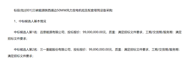 公告顯示,第一中標(biāo)候選人:遠(yuǎn)景能源有限公司,投標(biāo)報價:99,000,000.00元。第二中標(biāo)候選人:三一重能股份有限公司,投標(biāo)報價:99,890,000.00元。第三中標(biāo)候選人:明陽智慧能源集團股份公司,投標(biāo)報價:104,000,000.00元。