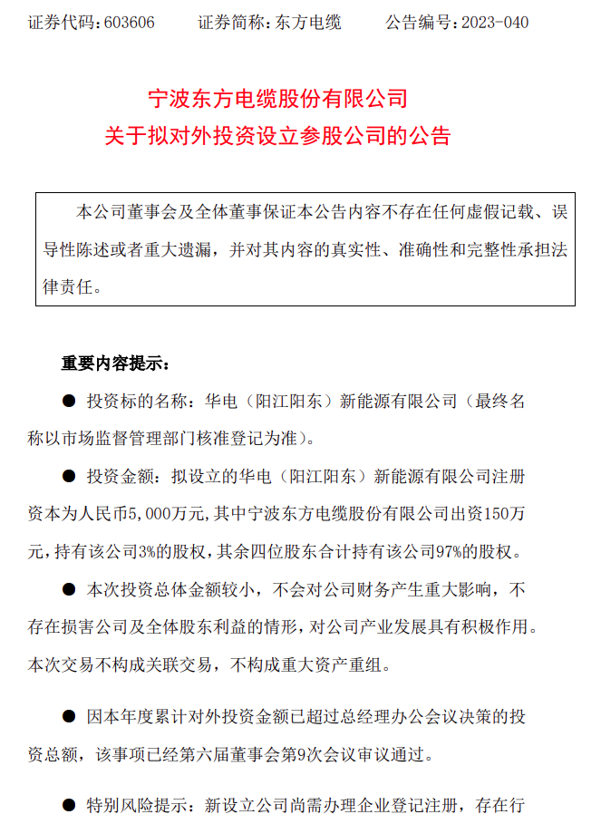 12月2日,東方電纜發(fā)布關(guān)于擬對外投資設(shè)立參股公司的公告。根據(jù)公告顯示,華電新能源集團(tuán)股份有限公司、廣東金風(fēng)科技有限公司、寧波東方電纜股份有限公司、中國水利水電第四工程局有限公司、海南程邦投資控股有限公司 五方共同出資在廣東省陽江市成立合資公司負(fù)責(zé)廣東華電陽江三山島六50萬千瓦海上風(fēng)電項目投資、建設(shè)、 運營。