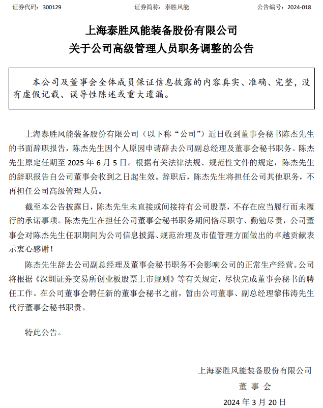 3月20日,上海泰勝風(fēng)能裝備股份有限公司(簡稱:泰勝風(fēng)能)發(fā)布關(guān)于公司高級管理人員職務(wù)調(diào)整的公告。