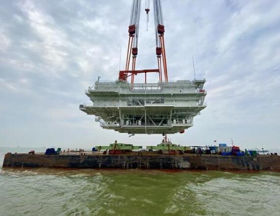近日,在杭州灣浙江省能源集團嘉興1號(以下簡稱嘉興1號)海上風電場的海面上,嘉興1號海上風電場海上升壓站的上部組塊——重達3000噸的“巨無霸”吊裝就位。