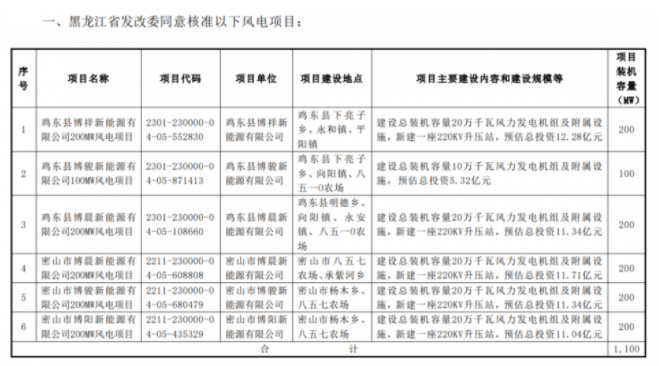 公告披露,寧夏嘉澤新能源股份有限公司下屬公司于日前收到了黑龍江省發(fā)展和改革委員會(以下簡稱“黑龍江省發(fā)改委”)出具的風(fēng)電項(xiàng)目核準(zhǔn)的批復(fù)文件,共計六個風(fēng)電項(xiàng)目獲得核準(zhǔn),總裝機(jī)容量為1100MW。