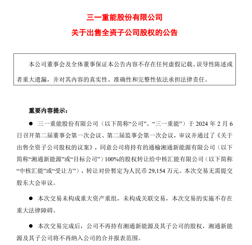 公告披露,公司將持有的通榆湘通新能源有限公司(簡(jiǎn)稱“湘通新能源”)100%的股權(quán)轉(zhuǎn)讓給中核匯能有限公司,轉(zhuǎn)讓對(duì)價(jià)暫定為2.92億元。