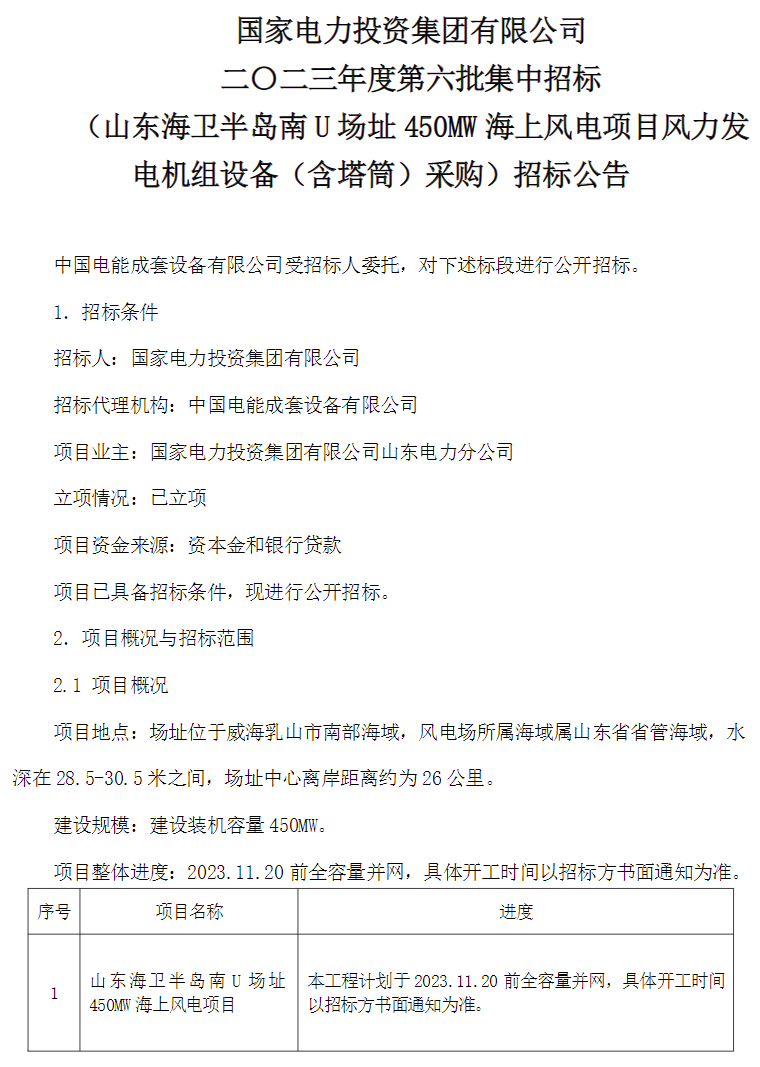 近日,國家電力投資集團有限公司發(fā)布二〇二三年度第六批集中招標(biāo)(山東海衛(wèi)半島南 U場址 450MW海上風(fēng)電項目風(fēng)力發(fā)電機組設(shè)備(含塔筒)采購)招標(biāo)公告,規(guī)模共計450MW,單臺機組容量要求 8.5MW及以上。