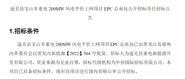 公告顯示,遜克縣寶山鄉(xiāng)重電200MW風(fēng)電平價(jià)上網(wǎng)項(xiàng)目位于黑龍江省黑河市遜克縣寶山鄉(xiāng)境內(nèi),場址中心距遜克縣城直線距離約50km,規(guī)劃裝機(jī)總?cè)萘繛?00MW,一次性建設(shè)完成,風(fēng)電場擬安裝32臺H193-6.25MW機(jī)型。
