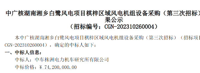 1月2日,中廣核電子商務(wù)平臺發(fā)布《中廣核湖南湘鄉(xiāng)白鷺風(fēng)電項目棋梓區(qū)域風(fēng)電機(jī)組設(shè)備采購(第三次招標(biāo))中標(biāo)結(jié)果公示》的公告。