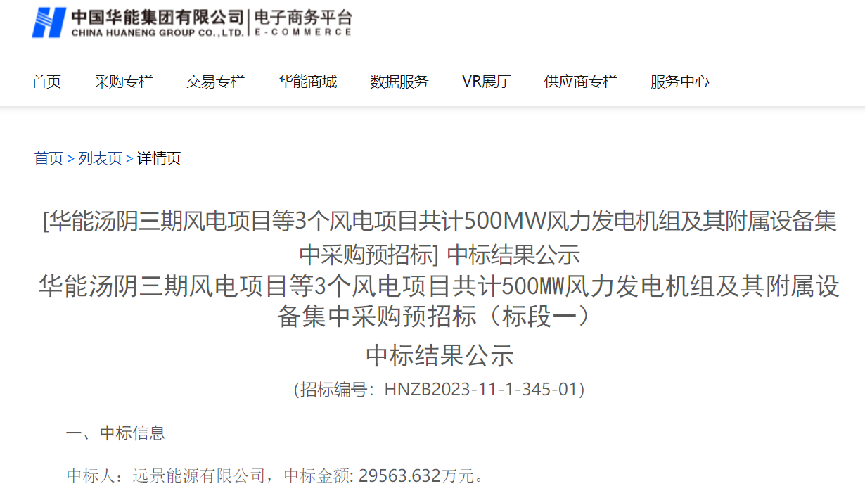 公告顯示,遠(yuǎn)景能源有限公司成功中標(biāo)該項(xiàng)目,中標(biāo)價(jià)格為29563.632萬元。