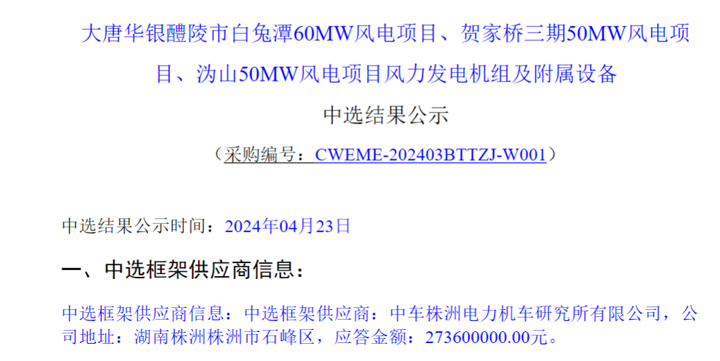 中車(chē)株洲電力機(jī)車(chē)研究所有限公司成功中標(biāo)大唐華銀醴陵市白兔潭60MW風(fēng)電項(xiàng)目、賀家橋三期50MW風(fēng)電項(xiàng)目、溈山50MW風(fēng)電項(xiàng)目,中標(biāo)價(jià)格為273600000.00元。