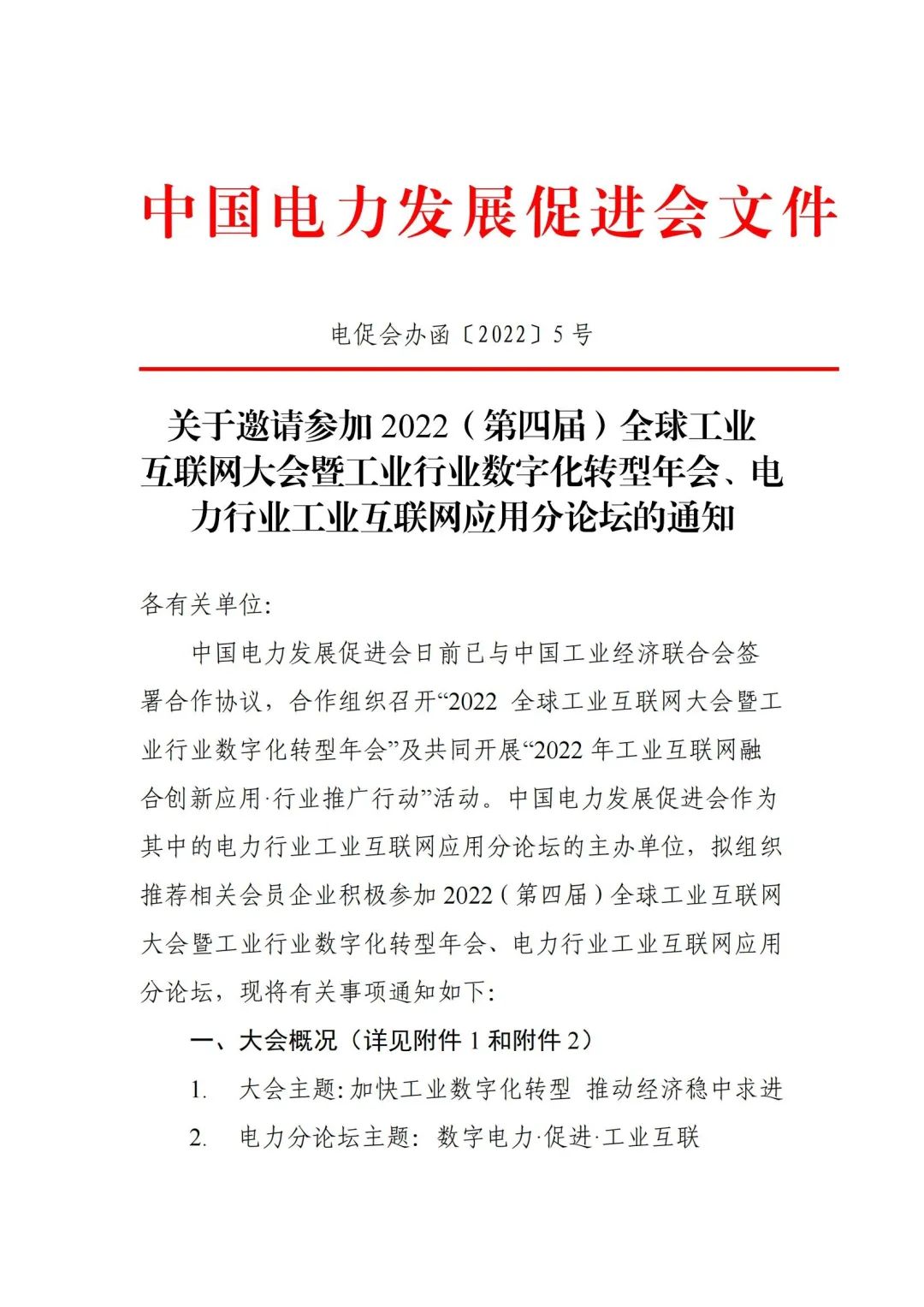關于邀請參加 2022(第四屆)全球工業(yè) 互聯網大會暨工業(yè)行業(yè)數字化轉型年會、電力行業(yè)工業(yè)互聯網應用分論壇的通知