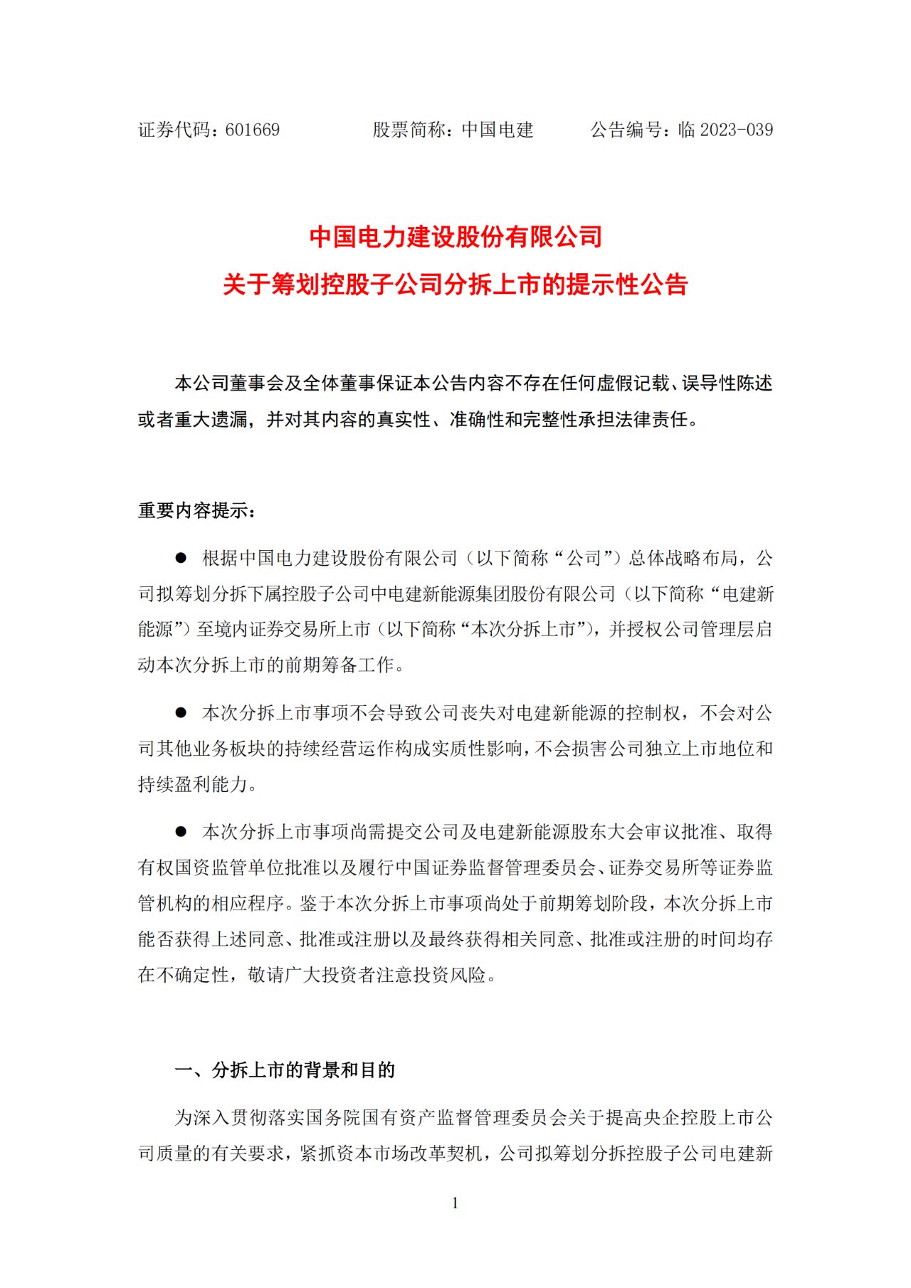 6月2日晚間,中國電力建設(shè)股份有限公司發(fā)布《關(guān)于籌劃控股子公司分拆上市的提示性公告》,擬將旗下中電建新能源集團(tuán)股份有限公司拆分至境內(nèi)上市,中國電建以新能源為核心的戰(zhàn)略轉(zhuǎn)型升級進(jìn)程,邁出了最關(guān)鍵一步。