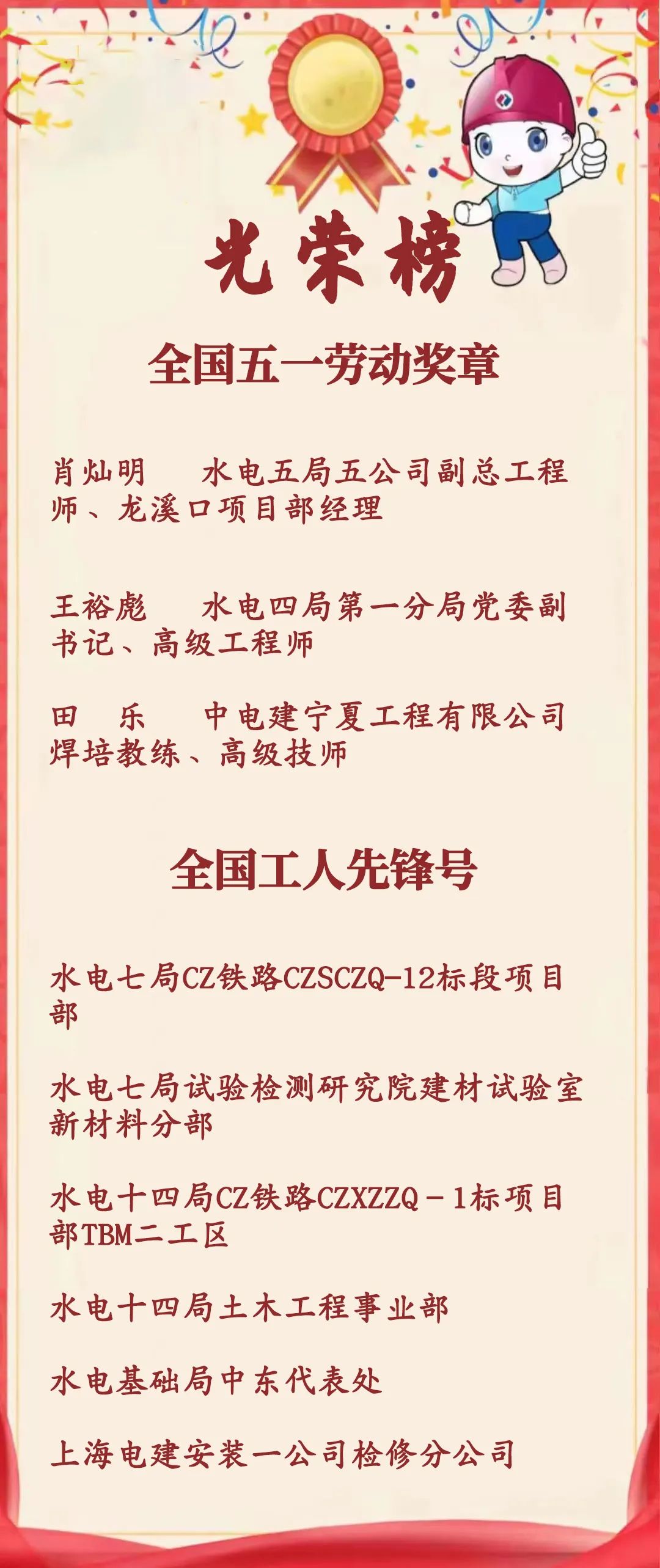 4月28日,2024年慶祝“五一”國(guó)際勞動(dòng)節(jié)暨全國(guó)五一勞動(dòng)獎(jiǎng)和全國(guó)工人先鋒號(hào)表彰大會(huì)在北京人民大會(huì)堂舉行。其中,中國(guó)電建9個(gè)集體和個(gè)人榮獲全國(guó)五一勞動(dòng)獎(jiǎng)?wù)潞腿珖?guó)工人先鋒號(hào)。