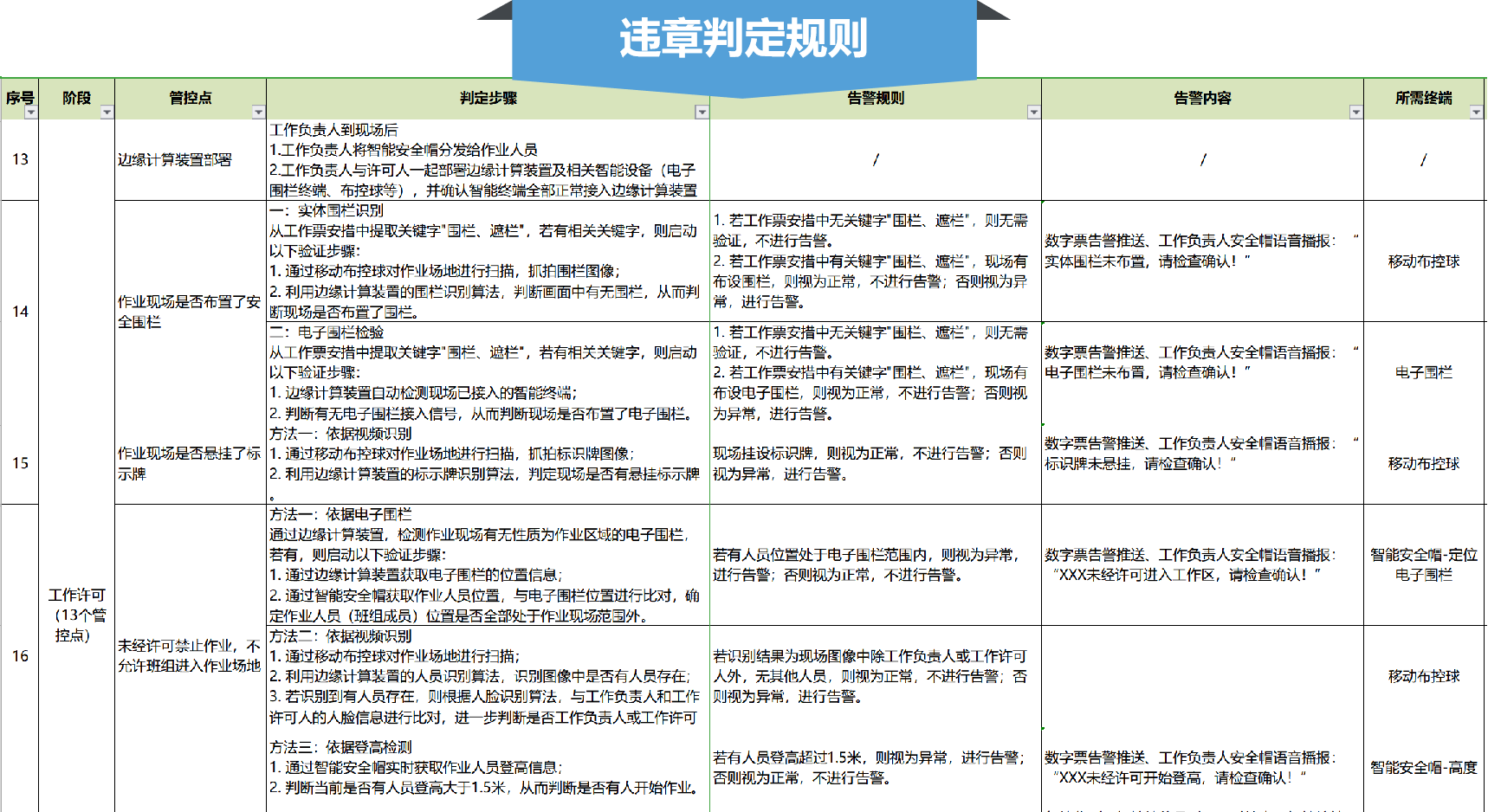 數(shù)字化安全管控判定規(guī)則是業(yè)務(wù)與科技融合的靈魂。在國(guó)網(wǎng)安監(jiān)部和國(guó)網(wǎng)浙江電力公司的指導(dǎo)下,國(guó)網(wǎng)信通產(chǎn)業(yè)集團(tuán)項(xiàng)目組深入輸、變、配一線班組調(diào)研,圍繞“四個(gè)管住”,全面梳理典型違章案例與安規(guī)標(biāo)準(zhǔn)內(nèi)涵,結(jié)合數(shù)字化工作票,設(shè)計(jì)形成《數(shù)字化安全管控違章判定規(guī)則》和118項(xiàng)風(fēng)險(xiǎn)管控點(diǎn),以技術(shù)手段彌補(bǔ)傳統(tǒng)安全管控存在的不足,為數(shù)字化安全管控的設(shè)計(jì)研發(fā)奠定業(yè)務(wù)基礎(chǔ)。