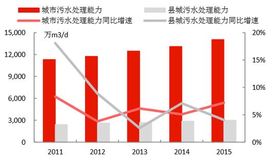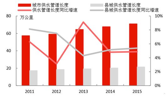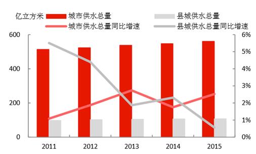 城鎮(zhèn)化的推進(jìn),為水務(wù)行業(yè)持續(xù)帶來增量空間。1)我國(guó)城鎮(zhèn)人口2015年達(dá)到7.71億,近年城鎮(zhèn)人口增速維持在3%左右;城市建成區(qū)面積2015年達(dá)到5.21萬平方公里,近年面積增速維持在4-5%。2)城市供水總量在2015年達(dá)到561億立方米,同比增速為2.5%;縣城的供水量達(dá)106.9億立方米,增速有所下降,僅為0.56%。3)城市供水管網(wǎng)長(zhǎng)度在2015年達(dá)到71.0萬公里,同比增速為4.87%;縣城的供水管網(wǎng)長(zhǎng)度為21.5萬公里,同比增速達(dá)5.39%;通過管網(wǎng)建設(shè),是的用水普及率持續(xù)提升,城市和縣城2015年的用水普及率分別為98.1%和90.0%。4)城市污水處理能力在2015年達(dá)到1.40億立方米/日,同比增長(zhǎng)7.19%;縣城達(dá)到2999萬立方米/日,同比增長(zhǎng)了4.06%,城市和縣城的污水處理率分別達(dá)到91.9%和85.2%,較2010年分別提升了9.6和25.1個(gè)百分點(diǎn)。