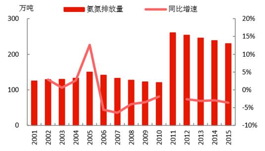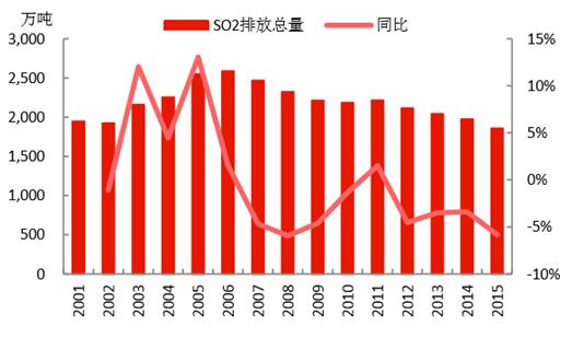 經(jīng)過“十二五”的治理,四項(xiàng)污染物減排約束性指標(biāo)均實(shí)現(xiàn)了持續(xù)下降,完成了“十二五”的減排任務(wù),取得了一定的環(huán)保成果。2015年:1)COD的排放量為2224萬噸,且每年以3%左右的速度下降;2)氨氮的排放量為230萬噸,且每年以3%左右的速度下降;3)SO2的排放量為1859萬噸,每年基本以4%左右的速度下降,而收關(guān)年2015年下降速度高達(dá)5.84%;4)NOx的排放量為1852萬噸,“十二五”剛開始治理,當(dāng)前的下降速度還處于上升趨勢(shì),收關(guān)年2015年下降速度高達(dá)10.89%。