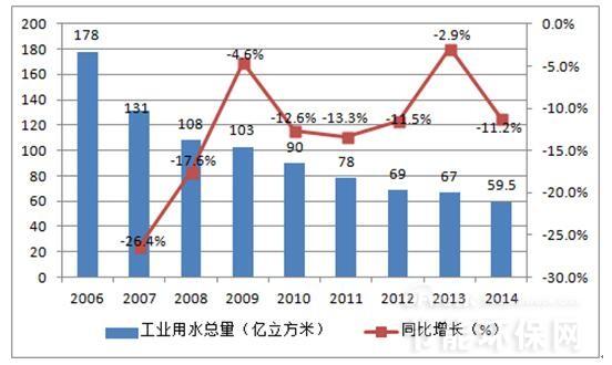 近年來(lái)我國(guó)工業(yè)用水一直處于一個(gè)較高的水平,據(jù)統(tǒng)計(jì),2006 年至2014 年我國(guó)工業(yè)用水量維持在1400 億立方米/年左右,大量的工業(yè)用水加劇了我國(guó)水資源緊缺的困境。與此同時(shí),我國(guó)每年排放大量的工業(yè)廢水,對(duì)環(huán)境造成重大污染。2014 年我國(guó)工業(yè)廢水排放量為205.3 億噸,同比減少2.1%。盡管我國(guó)工業(yè)廢水排放量逐年減少,但現(xiàn)階段工業(yè)污水排放量依然十分巨大。