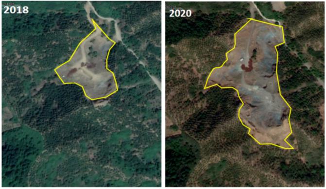 圖4 衛(wèi)星影像圖比對(duì)顯示,與2018年相比,2020年百砬溝廢棄礦山山體破壞面積增大