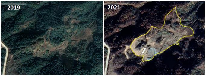 圖2 衛(wèi)星影像圖比對(duì)顯示,2019年以來(lái)興隆縣掛蘭峪鎮(zhèn)六撥子村一采礦點(diǎn)非法侵占六里坪獼猴省級(jí)自然保護(hù)區(qū)面積明顯增大