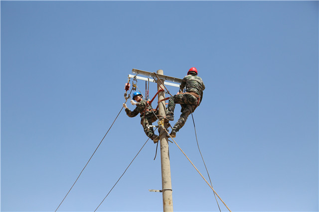 施工當(dāng)天烏海地區(qū)高溫來襲,施工難度陡增,六五四供電分局黨員突擊隊(duì)成員在三十五攝氏度的高溫下,頭頂烈日、腳踏電桿。按照分工干脆利落的進(jìn)行立桿、安裝橫擔(dān)、緊線等工作。經(jīng)過3個(gè)小時(shí)的作業(yè),終于順利地為此貧困戶送上電。貧困戶張占飛的母親非常激動(dòng)。“原先以為只是簡(jiǎn)單修一下,沒想到還需要這么多步驟,他們做得這么細(xì)致、這么認(rèn)真,真的是非常感謝他們。”