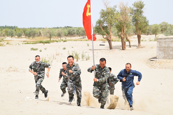 接著,大家從十六團(tuán)交叉路口出發(fā),高聲歌唱著“沒有共產(chǎn)黨就沒有新中國”“團(tuán)結(jié)就是力量”等紅色革命歌曲,沿河床徒步前行5公里,并穿插開展“沙漠沖拼”“坐地起身”“人椅”等豐富多彩的素質(zhì)拓展比拼項(xiàng)目。一路上,大家熱情高漲、團(tuán)結(jié)協(xié)作、奮勇爭(zhēng)先,團(tuán)隊(duì)合作精神體現(xiàn)得淋漓盡致。雖然天氣炎熱,道路崎嶇,但沒有一個(gè)人退縮、沒有一個(gè)人掉隊(duì),圓滿完成拓展訓(xùn)練任務(wù)。“這次黨的生日活動(dòng)別樣有趣,讓我們?cè)诜泵Φ墓ぷ髦喔惺艿剿刭|(zhì)拓展的趣味和意義,考驗(yàn)和鍛煉了大家的意志,促進(jìn)了黨員之間的交流、信任與默契,有助于提升黨員隊(duì)伍的凝聚力和戰(zhàn)斗力。” 黨員崔陽陽興致勃勃地說。