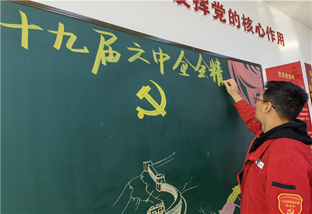 “線(xiàn)下”單位的青年黨員書(shū)寫(xiě)黑板報(bào),為了讓單位全體職工更全面、更及時(shí)地了解會(huì)議精神,黨員將十九屆六中全會(huì)的會(huì)議重點(diǎn)內(nèi)容經(jīng)過(guò)精心設(shè)計(jì)、編排,搬到了單位的黑板上。正在黨員活動(dòng)室閱讀黑板報(bào)的積極分子說(shuō):“這個(gè)板報(bào)對(duì)全會(huì)的內(nèi)容歸納清晰、通俗易懂,這樣的學(xué)習(xí)形式讓我好像一下回歸學(xué)生時(shí)代,很受大家的歡迎。”除此之外,六五四供電公司黨支部還組織黨員結(jié)合工作崗位深入交流研討、撰寫(xiě)心得體會(huì),在學(xué)習(xí)中談?wù)J識(shí)體會(huì)、話(huà)發(fā)展變化,深化思想啟迪、促進(jìn)共同提高。