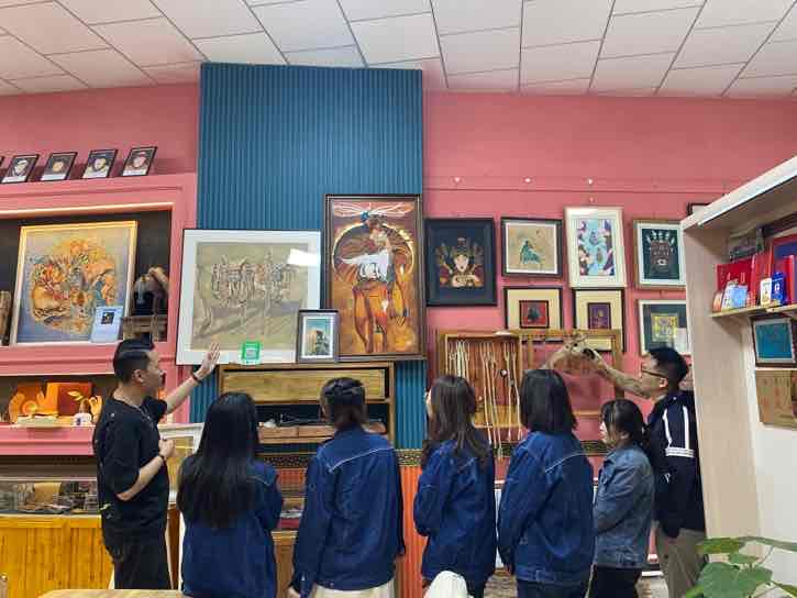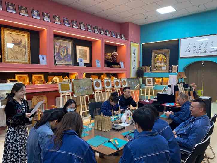 本次活動內(nèi)容豐富,黨員干部職工積極前往阿拉善盟非物質(zhì)文化遺產(chǎn)皮雕藝術(shù)傳承研究展示中心參觀并體驗(yàn)非遺文化皮雕技藝。首先,由阿拉善盟非物質(zhì)文化遺產(chǎn)傳承人“皮雕匠人”張浩老師向大家介紹皮雕技藝在阿拉善地區(qū)傳承發(fā)展的歷史以及在展的各種皮雕藝術(shù)品,并現(xiàn)場演示了皮雕制作的基本技法,緊接著帶領(lǐng)大家制作傳統(tǒng)皮質(zhì)鑰匙包。職工們熱情高漲,紛紛動手操作,開料、刻線、描摹、染色、縫線,皮面和針線來回穿插,充分體驗(yàn)到了非遺的魅力和手作的樂趣,最后在緊張刺激的民族團(tuán)結(jié)知識問答題中結(jié)束了本次活動。