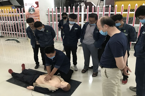 安全員李燾首先帶領(lǐng)大家觀看視頻教程,把心肺復蘇的整個過程,每一個細節(jié)都進行了認真的學習,隨后在模擬人上進行實際操作。安全員一邊做示范一邊講解如何掌握基本心肺復蘇的操作要點及注意事項,并通過對“模擬人”實施心臟復蘇搶救操作進行了演示,包括判斷是否喪失意識、判斷有無自主呼吸、判斷有無脈搏、進行胸外心臟按壓、清理口腔異物、開放氣道、人工呼吸等操作要領(lǐng)的示范。