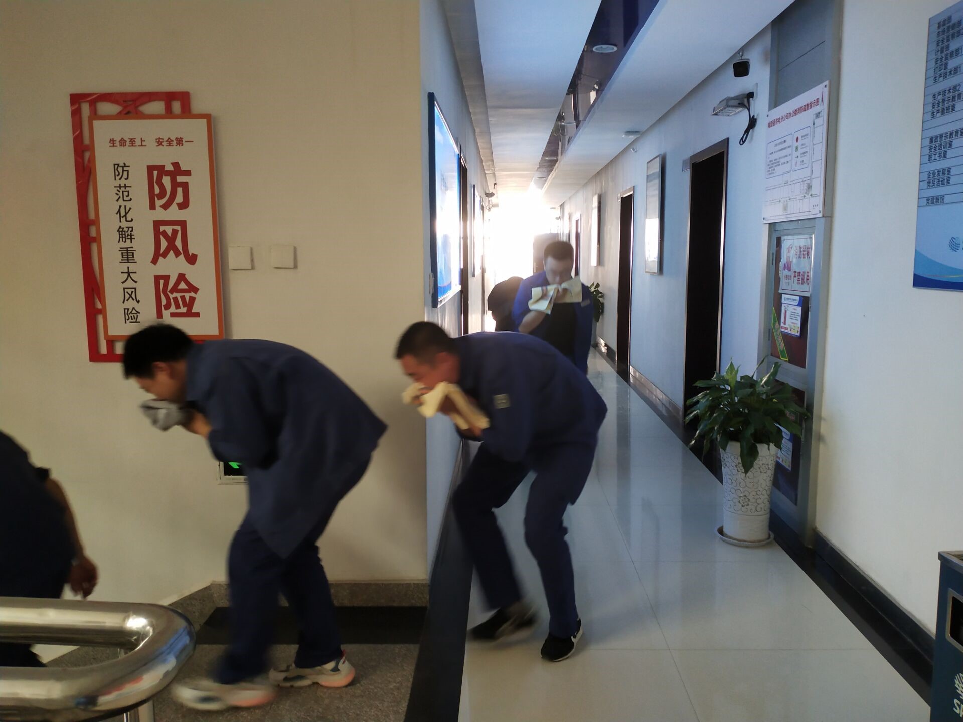 接著,隨著機(jī)關(guān)大樓火警響起,應(yīng)急疏散演練活動(dòng)正式開始,全體員工在該公司應(yīng)急消防員的引導(dǎo)下用手捂著口鼻,彎著身子,有序地按照既定逃生路線逃生,安全到達(dá)指定地點(diǎn)集合,應(yīng)急疏散逃生演練圓滿完成,取得了預(yù)期效果。