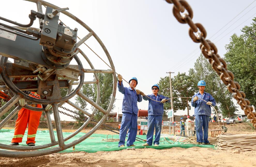 近日,河北省石家莊晉州市氣溫持續(xù)攀升,在河北石家莊晉州園區(qū)110千伏輸變電線路工程施工現(xiàn)場,國網(wǎng)石家莊供電公司的50多名施工人員正在有條不紊地開展張力放線施工作業(yè)。