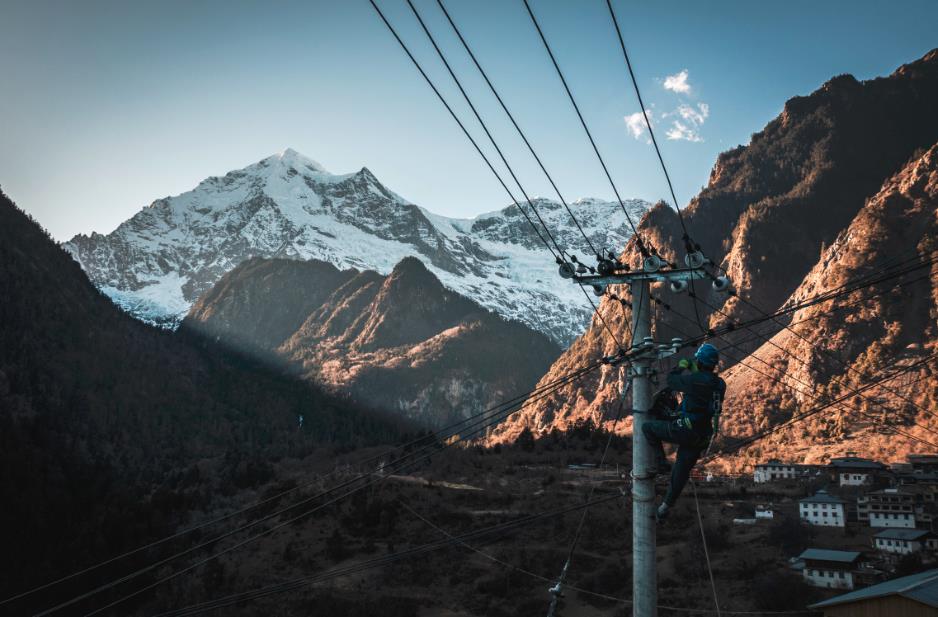 收到村民反映停電故障后,旺登一行立即開(kāi)展檢查,發(fā)現(xiàn)故障出現(xiàn)在雨崩上村2號(hào)臺(tái)區(qū),且需要爬上12米高的電線桿進(jìn)行作業(yè)。只見(jiàn)旺登綁緊安全帶,戴上絕緣手套,踩實(shí)腳扣,并進(jìn)行簡(jiǎn)短的沖擊試驗(yàn)。隨后,他雙手扶住桿體,左腳穩(wěn)穩(wěn)地扣住,接著右腳向上提,一步一步交叉著往上。