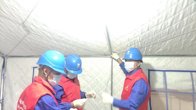 獲知信息后,共產(chǎn)黨員服務(wù)隊迅速在駐地準(zhǔn)備好照明燈、線材、插座等物資,向著廣場進發(fā)。接線、固定、檢查,隊員們有條不紊的進行著每一個環(huán)節(jié),不一會,核酸檢測點帳篷里的燈被點亮。