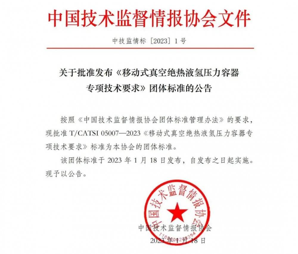 近日,中國技術(shù)監(jiān)督情報(bào)協(xié)會(huì)正式發(fā)布T/CATSI 05007—2023《移動(dòng)式真空絕熱液氫壓力容器專項(xiàng)技術(shù)要求》團(tuán)體標(biāo)準(zhǔn)(以下簡稱“標(biāo)準(zhǔn)”),自發(fā)布之日起正式實(shí)施。該標(biāo)準(zhǔn)由中集安瑞科旗下南通中集能源裝備有限公司(簡稱”南通能源“)牽頭起草。
